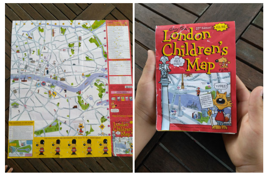 Die erste Sache, die sich als toll erwiesen hat, war die Karte „London Children´s Map„. Mit dieser haben wir immer den Tag noch einmal Revue passieren lassen und angekreuzt, wo wir waren. Gleichzeitig haben wir dann immer den Folgetag vorbereitet. Toll sind vor Allem die mitgelieferten Aufkleber, etwa: „Hier habe ich ein Restaurant besucht“ oder „Hier habe ich einen Dino gesehen“. Die Aufkelber kann man auf der Karte anbringen und hat so eine schöne Erinnerung an den Tag.