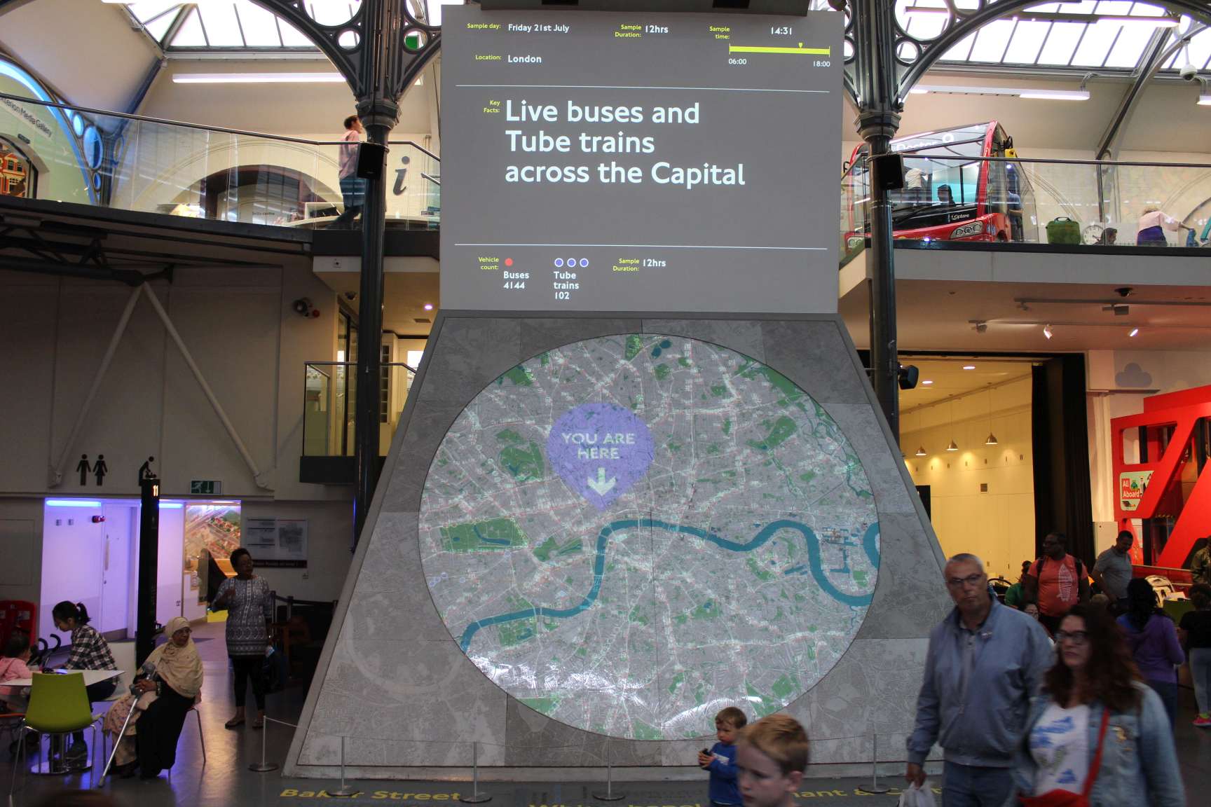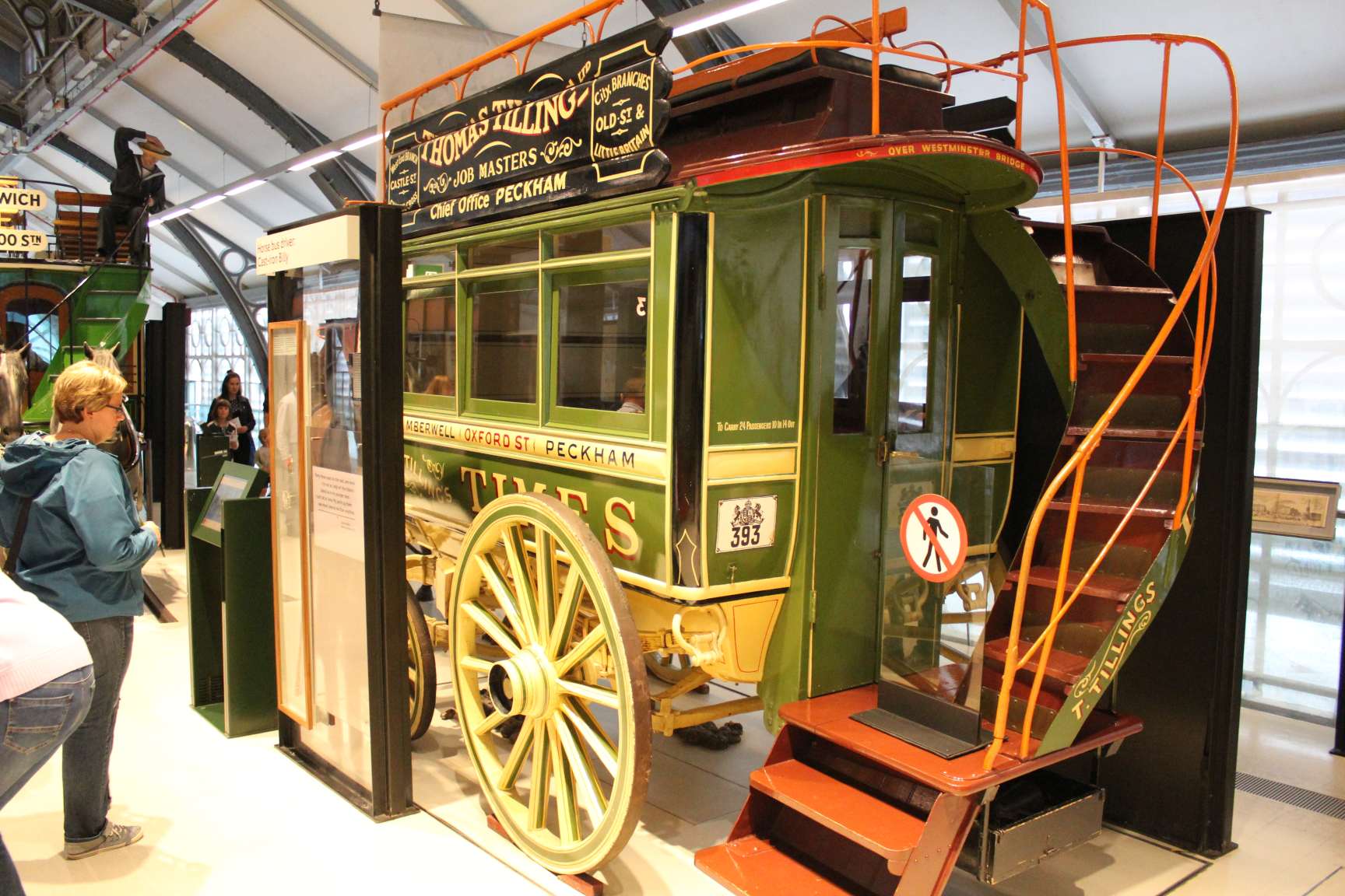 Aber genug der Einleitung. Im Museum selber war ich wirklich positiv überrascht. Hier gibt es – wie der Name es schon sagt – die Geschichte des Öffentlichen Transportwesens in London zu bestaunen. Denn London war eine der ersten Städte mit einem ausgedehnten und funktionalen ÖPNV. Von der Pferdekutsche über die Entstehung der Tube, bis hin zu den roten Doppeldeckern gibt es einigen zu sehen und zu entdecken. Besonders interessant sind dabei die vielen Originalgefährte, bei denen auch öfter gilt: einsteigen erlaubt und erwünscht. Die Sammlung begründet hat dabei ein Pferdebus aus dem Jahr 1920. Sie markiert somit auch den historischen Startpunkt des Museums. Besonders interessant fand ich die große interaktive Karte, auf der gezeigt wird, wo, wie und wann welcher tube-Zug in der Stadt unterwegs ist und welch eine Koordinationsaufgabe hinter diesem System stecken muss