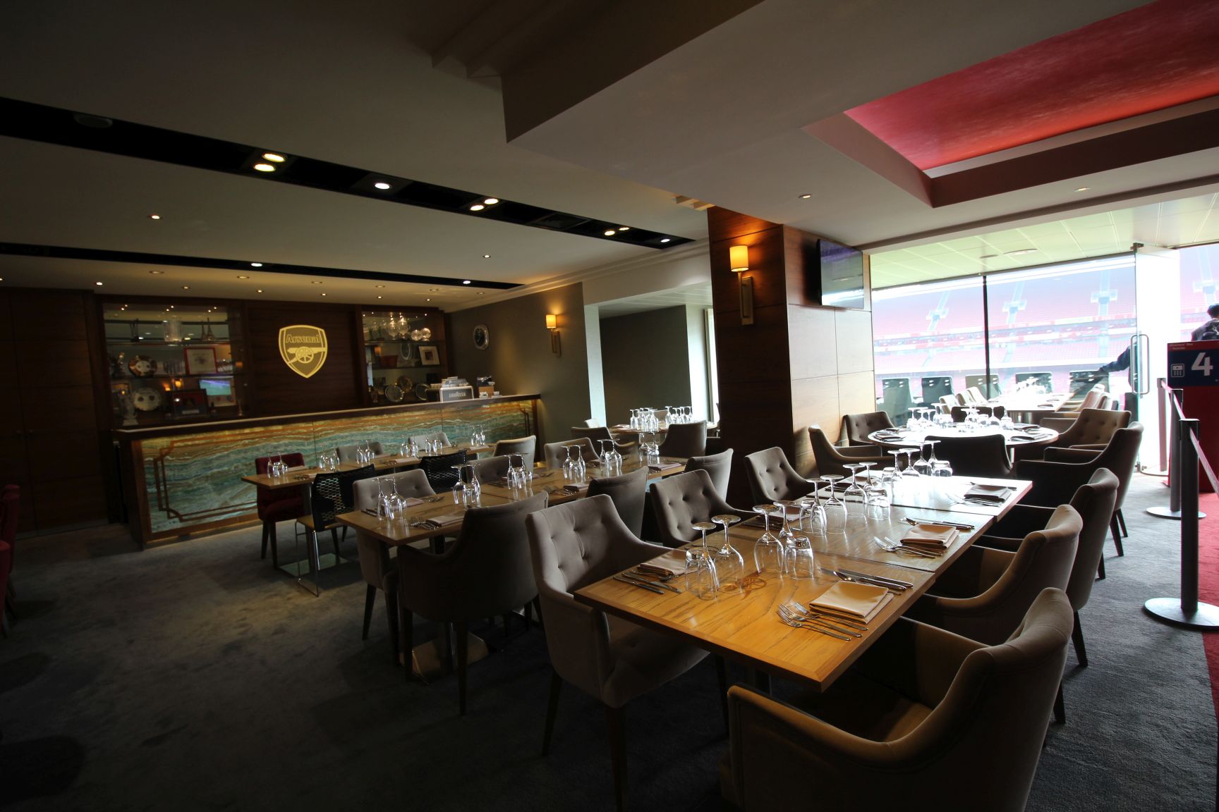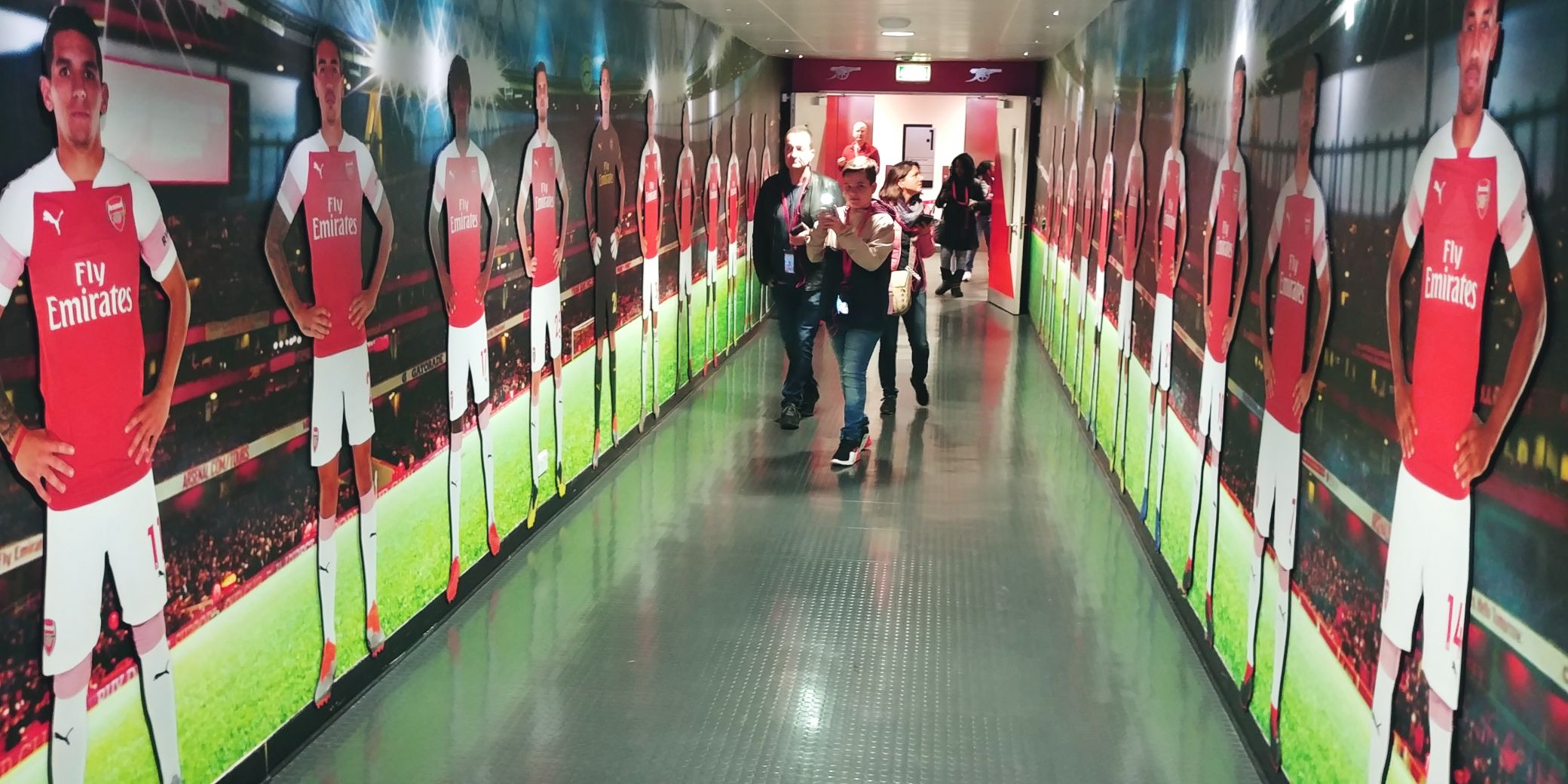 Weiter geht der Weg über das hausinterne Sternerestaurant – dem Diamond Club – hinunter zum Spielereingang. Hier prankt direkt beim Eintritt ein riesiges Arsenal-Wappen an der Wand, der Grundstein des erst 2006 eingeweihten Stadionsliegt sichtbar unter Glas. Nachdem man sich vor einem Greenscreen fotografieren lassen kann (am Schluss können die Fotos, in verschiedene Zeitungen etc. hineinmontiert, käuflich erworben werden, geht es weiter. Gästekabine, Umkleide- und Wellnessbereich der Spieler, das Büro des Trainers sind die Stationen, bevor es durch den Tunnel wieder ins Innere des Stadions geht. Hier kann man auf dem Platz der Spieler und des Trainers Platz nehmen und sich vorstellen, einmal die Gunners zu coachen.