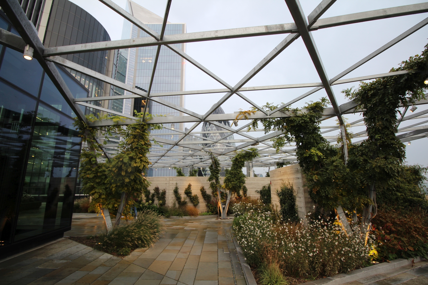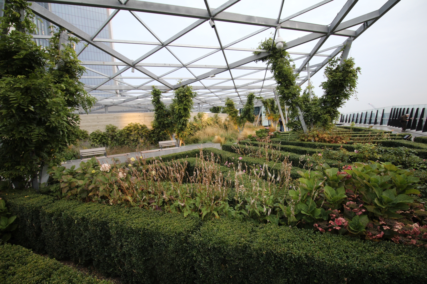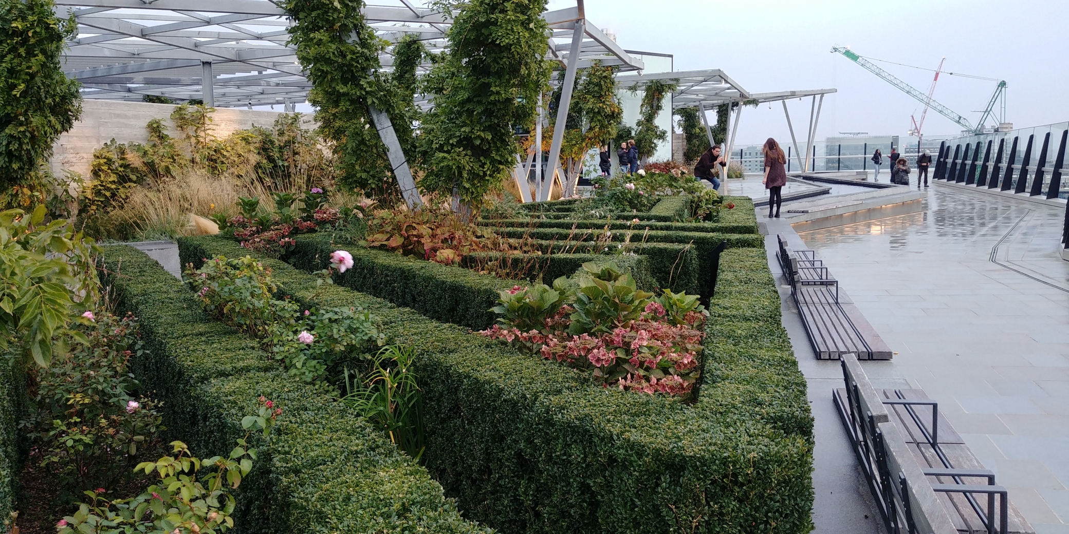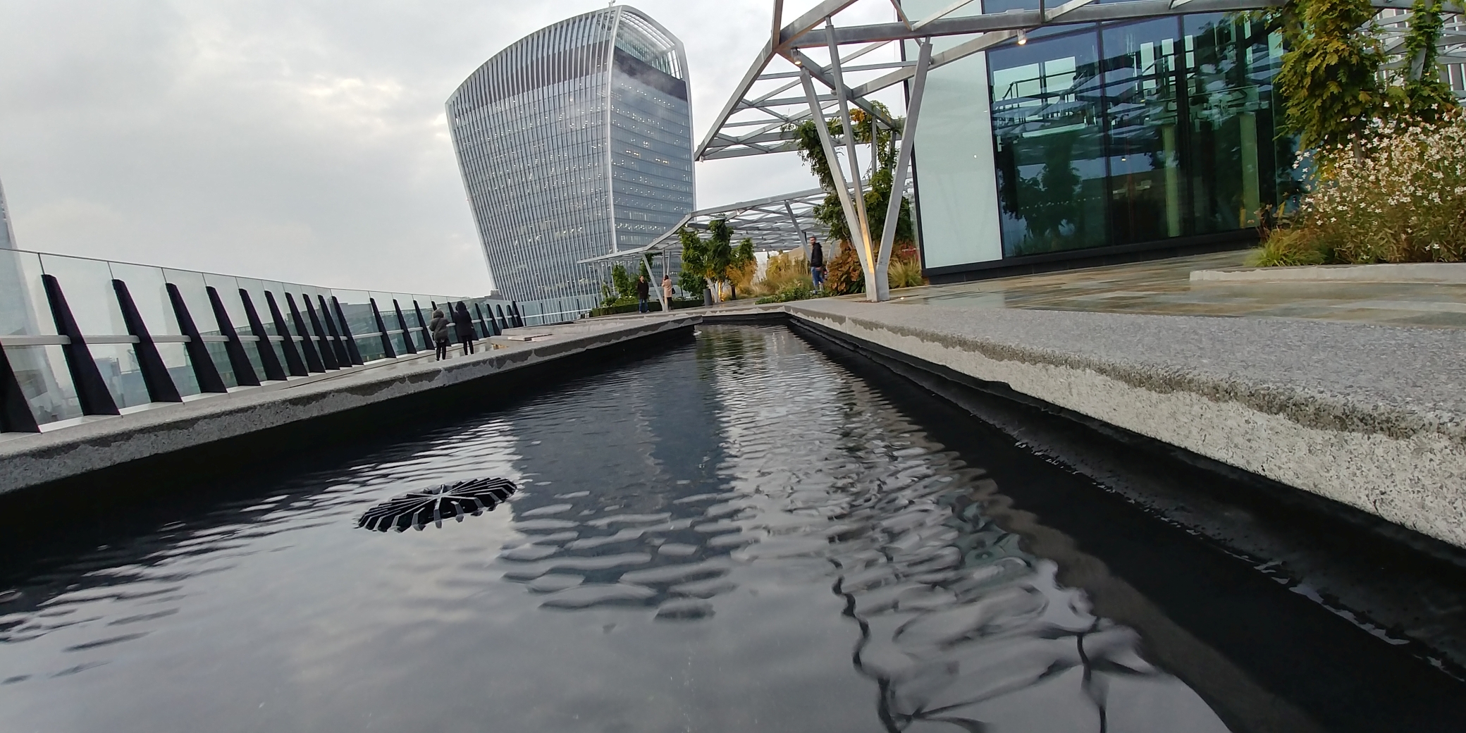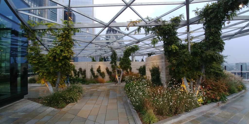 Die Terrasse ist zwar nicht so hoch, wie etwa das 200 Meter entfernte Sky Garden, jedoch ist sie ähnlich einem Park angelegt – mit vielen Pflanzen, Beeten und einem kleinen Wasserlauf. Hier zu sitzen und zu entspannen ist wahrscheinlich vor Allem im Sommer ein tolles Erlebnis. Die Beete sind aufwändig bepflanzt und toll angelegt. Die ganze Terrasse ist gut unterteilt und so konzipiert, dass man nicht das Gefühl hat, auf einer riesigen freien Fläche zu stehen, sondern immer eine Nische für sich finden kann.