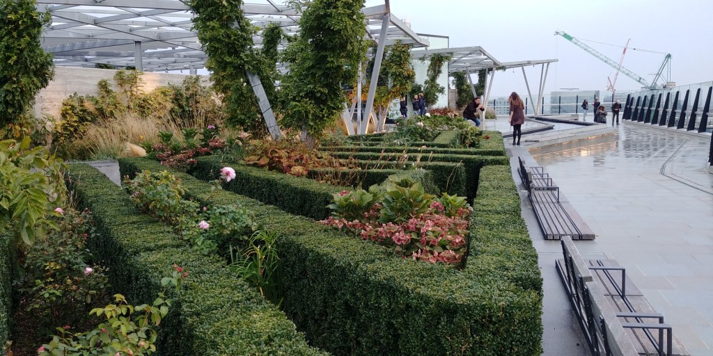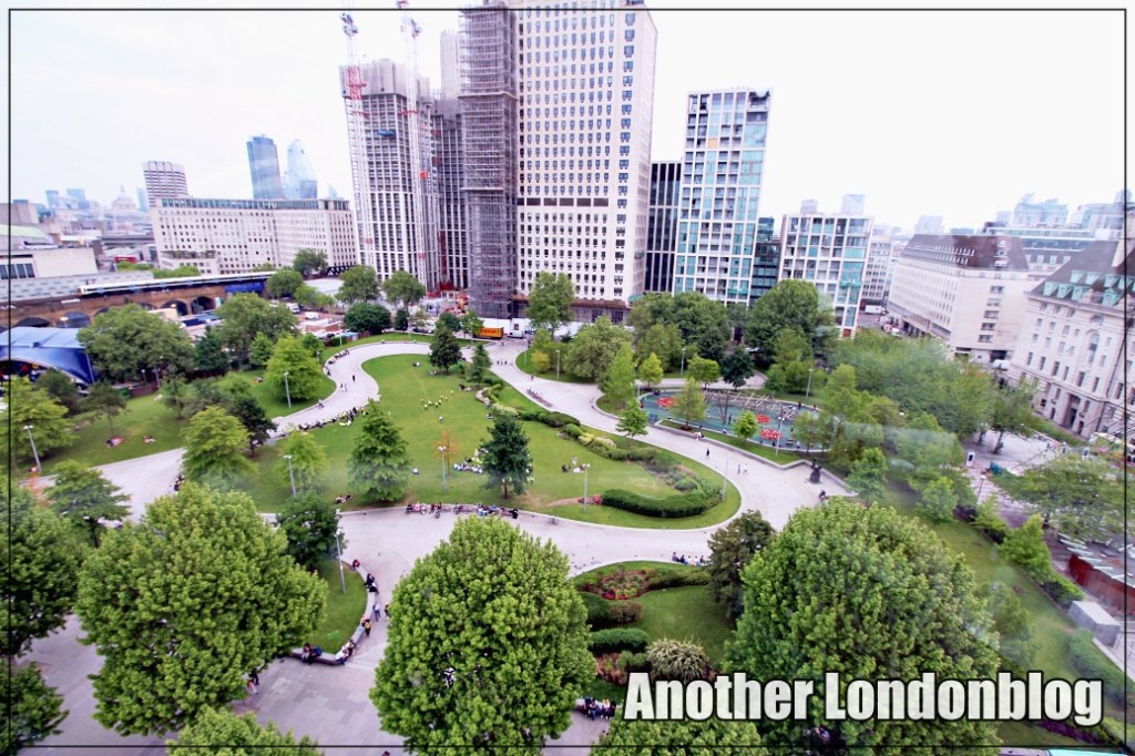 Nicht ganz so hoch, ist der Ausblick auf den Tower, die Gherkin und diverse andere Gebäude doch immer noch sehr schön, und aufgrund der halb hohen Ebene ganz spannend, da man nicht unbedingt von oben auf die Gebäude schaut. Auch der angelegte Garten ist wirklich nett. Vor Allem im Sommer (nicht überdacht!) ist The Garden at 120 einen Abstecher wert!