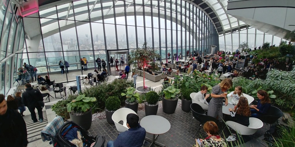 Ich schätze Sky Garden sehr. Der Rundumblick ist hervorragen, es gibt kleinere Ecken, in die man sich zurück ziehen kann und durch die zu buchenden Timeslots wird es nie zu voll. Die Lage, inmitten des Bankenviertels ist für einen tollen Ausblick prädestiniert. Tower, Shard, Londonbridge, … viele der bekannten Sehenswürdigkeiten kann man von hier erspähen. Es lohnt sich, dort in Ruhe einen Kaffee, Sekt oder Bier zu trinken, ein Stück Carrotcake essen und den Blick zu genießen.