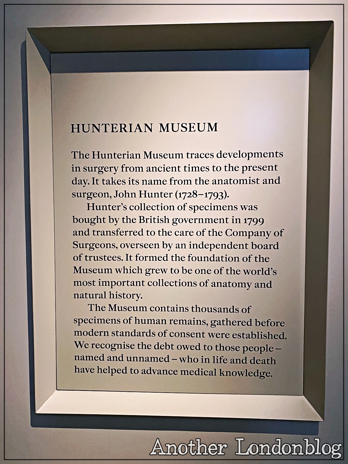 Auch über seine Jahre als erfolgreicher Chirurg (es wurde 1819 sogar eine Vereinigung für Ärzte und Zahnärzte nach ihm benannt – die Hunterian Society) war er seinem jugendlichen Interesse an der Anatomie aber immer treu. Er legte über die Dauer seines Lebens eine Sammlung von etwa 14.000 Exponaten an; sowohl tierischen, als auch menschlichen Ursprungs.