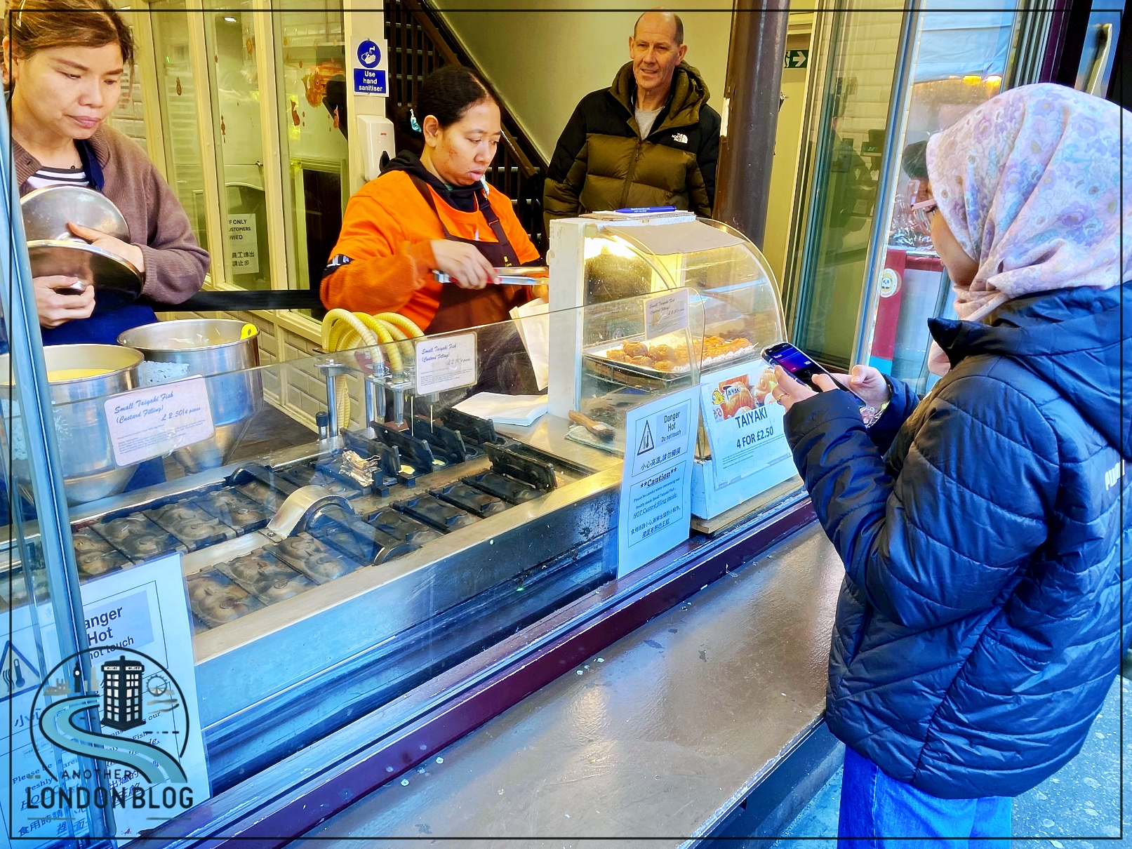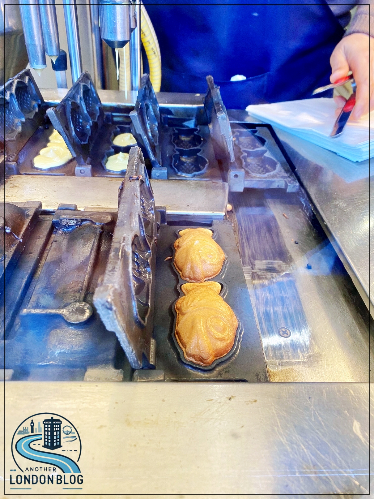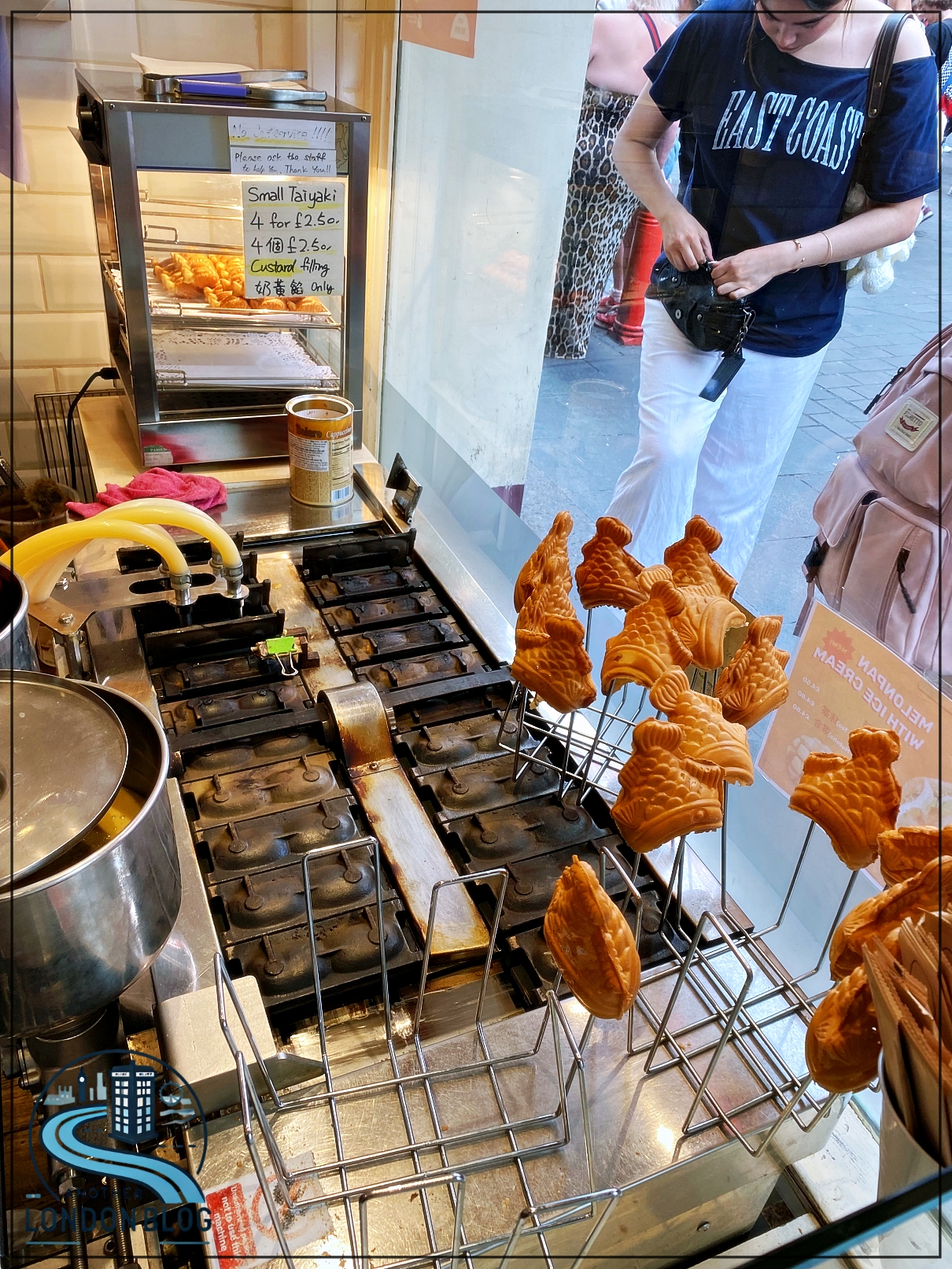 - Taiyaki – Diese traditionellen japanischen Fisch-förmigen Waffeln gibt es hier mit unterschiedlichen Füllungen, u. a. roter Bohnenpaste, Vanillecreme oder Schokolade. Frisch vor deinen Augen gebacken, sind sie knusprig außen und herrlich weich und cremig innen. Mein Sohn – ein großer Manga-Fan, war begeistert.