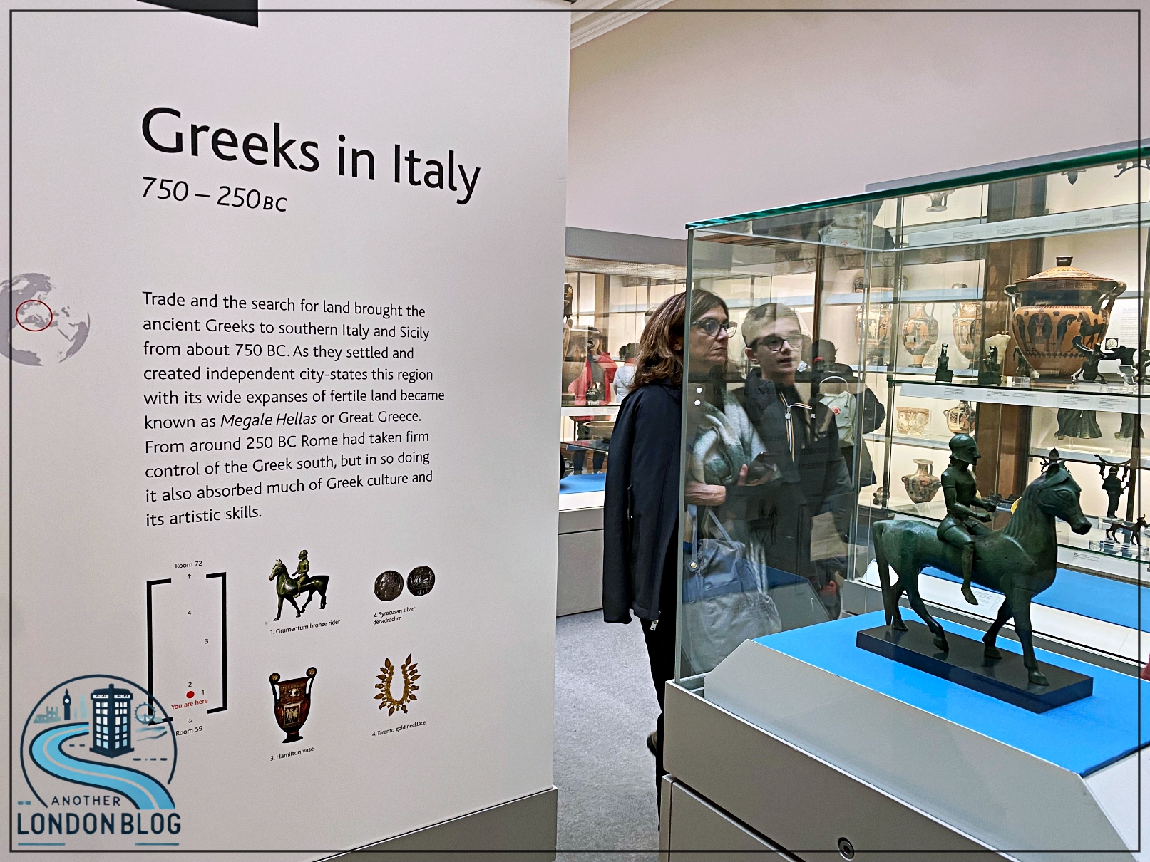 Ein weiterer Besuchermagnet ist die griechische Sammlung, zu der unter anderem die berühmte Büste des Perikles, der kunstvoll bemalte Euphorbos-Teller sowie Teile des Parthenon-Frieses (auch bekannt als Elgin Marbles) gehören.